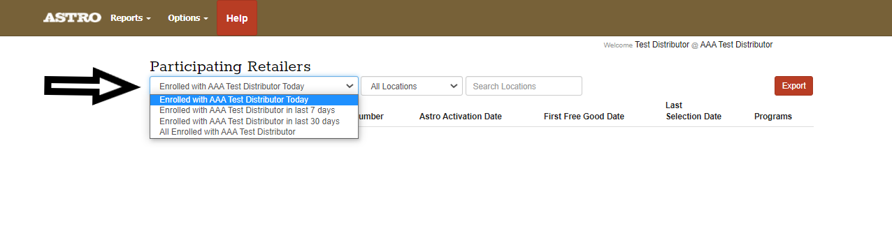 The Participating Retailers page gives distributors the ability to view which retailers enrolled with them today, last week, or in the previous 30 days. To narrow down when a retailer began reporting to your company, use the drop-down menu and select the time frame you wish you view. Any of the lists can be exported by simply clicking the Export button on the right of the screen.